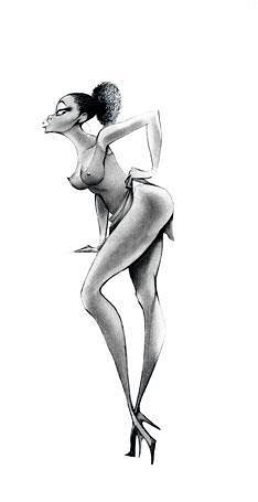 Suas principais características como chargista são o traço único e elegante e o recorrente desenho de mulatas e